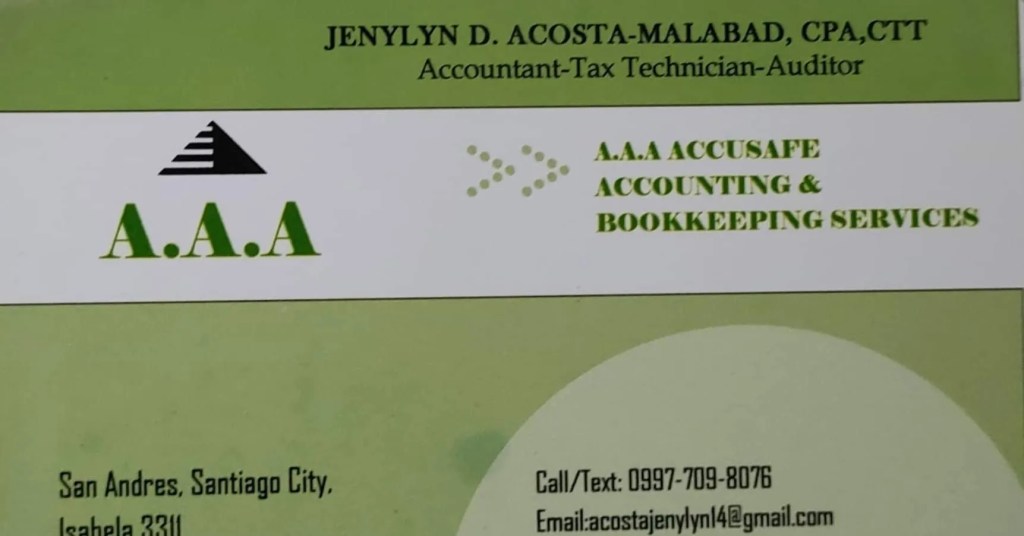 Jenylyn A. Malabad CPA,CTT Accusafe Accounting & Bookkeeping Services acostajenylyn14@gmail.com Life is like an accounting, everything must be balanced.